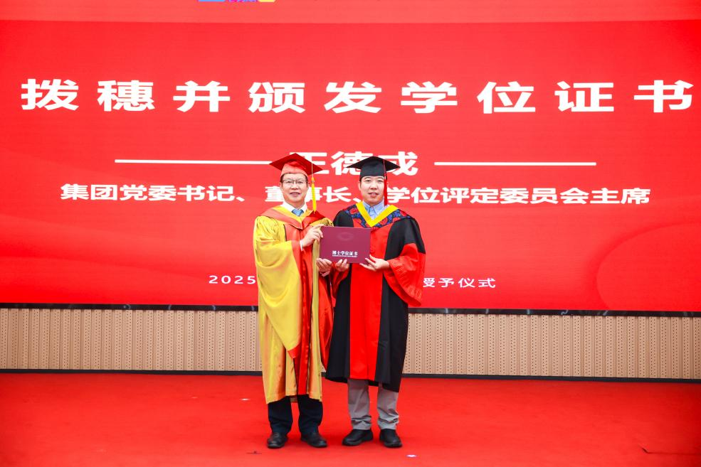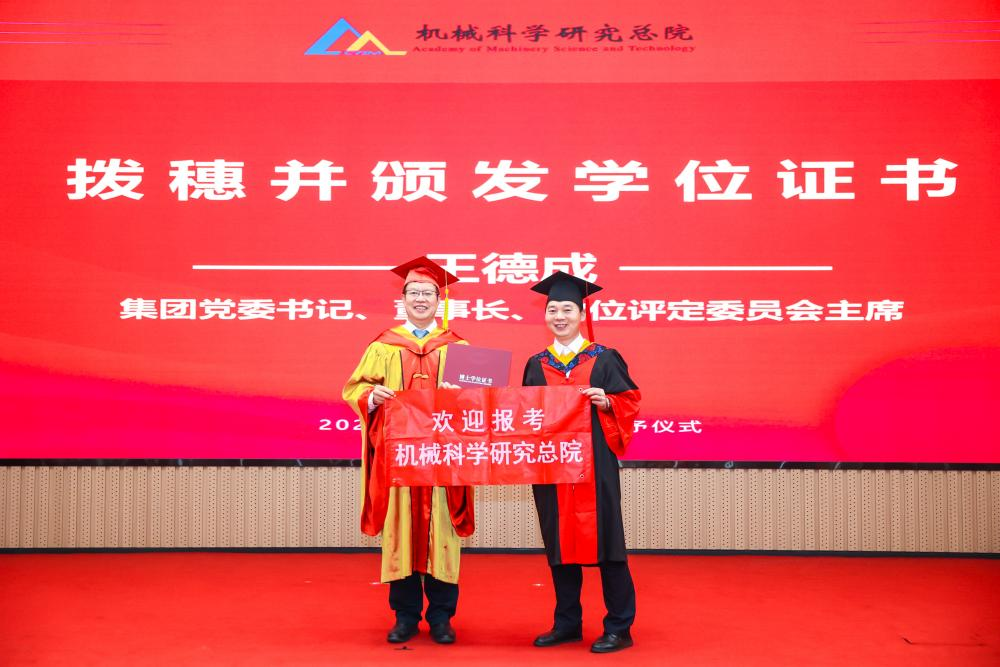 李愛國宣讀了《機械科學研究總院2025屆畢業生學位授予決定》,王德成為每位畢業生撥穗正冠并頒發學位證書。